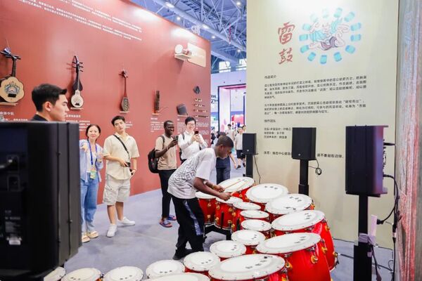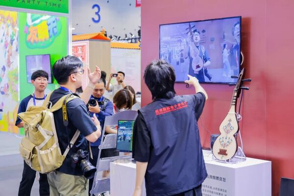 许多观众被利用数字驱动技术研发的敦煌壁画仿制乐器所吸引,在现场进行乐器互动演奏。