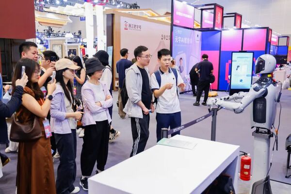 在“音乐人工智能特展,观众亲手体验交互音乐装置、AI音乐教育系统,并跟随指挥机器人哼唱颇具国庆氛围的歌曲《万疆》。