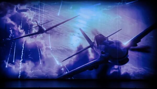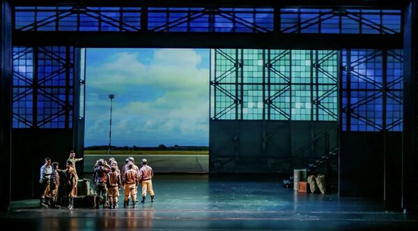 “本剧情景多、变化频繁、多时空并列,迁换需要快速高效。”丁丁介绍,为此,他在舞台三分之一深处,设置了一组可以开合的“云”景片,在深度上分割舞台空间,功能上则保证前区演出时后区换景的遮挡需要,“云开云合”完成瞬间的空间重组、传递信息和情感,增强艺术感和观赏性;加之现场以冷峻的钢铁结构象征战争的残酷与男性的阳刚,配合多媒体技术营造空战的激烈效果,最终呈现出极具冲击力的视觉画面。