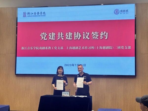 为贯彻党的二十大精神,深入开展学习贯彻习近平新时代中国特色社会主义思想主题教育,落实教育部高校“访企拓岗”文件精神,推动具体工作走深走实,推进党建业务融合发展,7月16日,上海越剧院党政班子成员与二团党支部在党总支书记、院长吴巍的带领下,到我校戏剧系调研座谈。本着“优势互补、资源共享、相互促进、共同提高”的原则,戏剧系教工党支部与上海越剧艺术传习所(上海越剧院)二团党支部签订了《党建共建协议》。