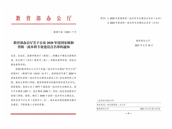 据悉,一流本科专业建设“双万计划”是教育部全面振兴本科教育、提高高校人才培养能力、实现高等教育内涵式发展的重要举措,自2019年起分3年建设10000个左右国家级一流本科专业点和10000个左右省级一流本科专业点。2020年度为第二次申报,经过全国各高校申报、高校主管部门审核、教育部高等学校教学指导委员会评议、投票,最终教育部共认定3977个国家级一流本科专业建设点及4448个省级一流本科专业建设点。