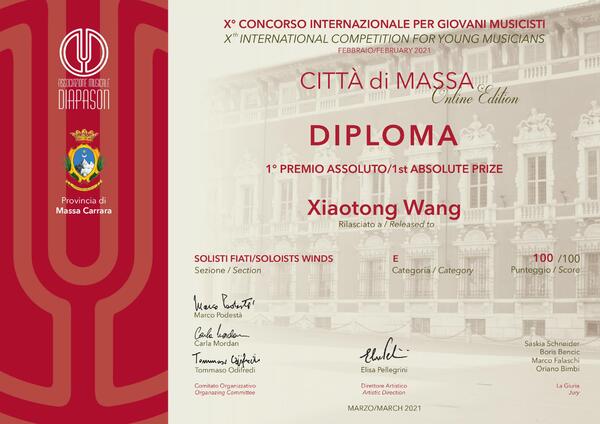 据悉,马萨第十届国际青年音乐家比赛由Diapason国际音乐家协会与马萨省政府联合举办,旨在发掘青年演奏家的音乐天分,通过比赛不断提升其专业演奏水准。评委由来自意大利、美国、德国、法国、斯洛文尼亚等多个国家的优秀演奏家组成。