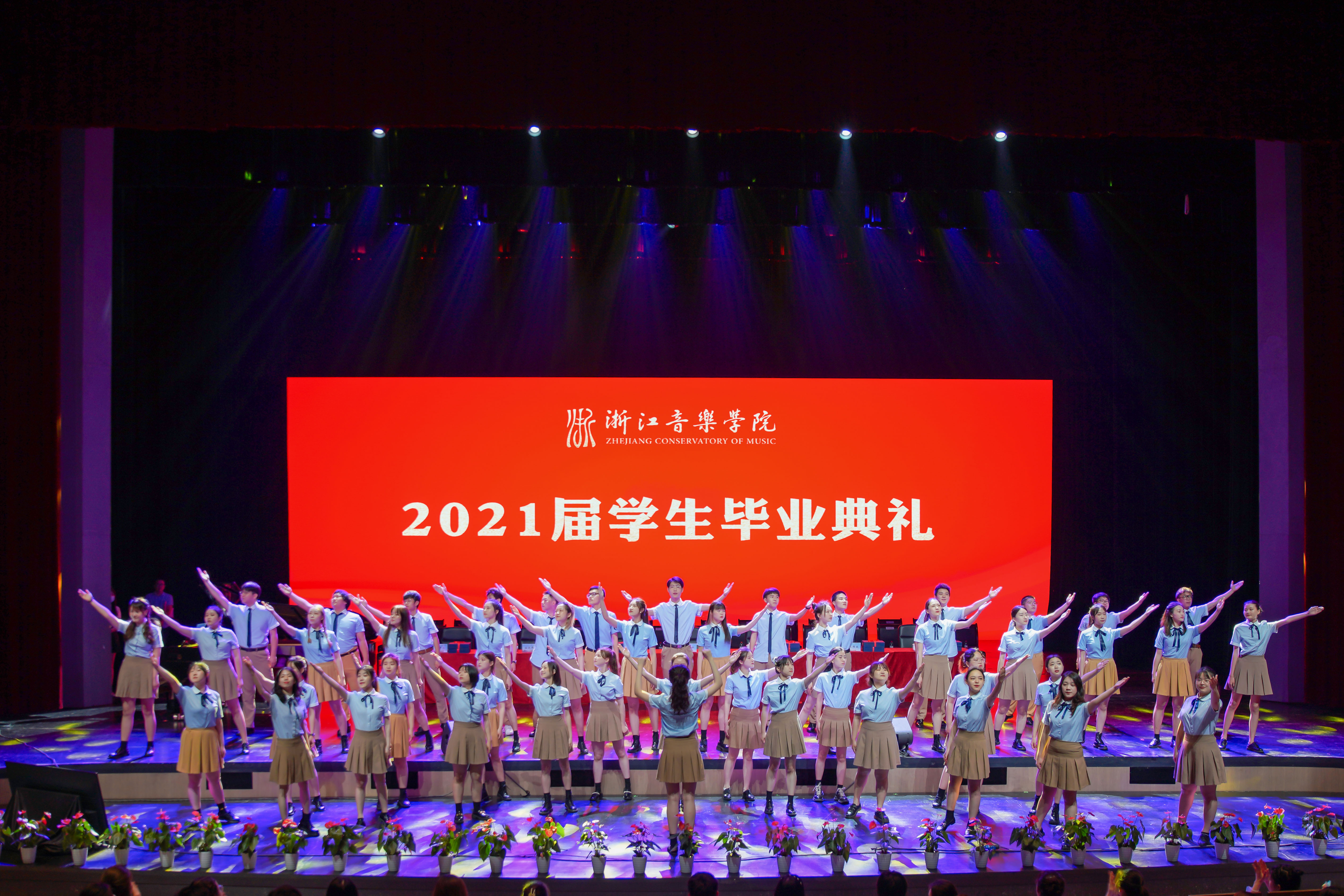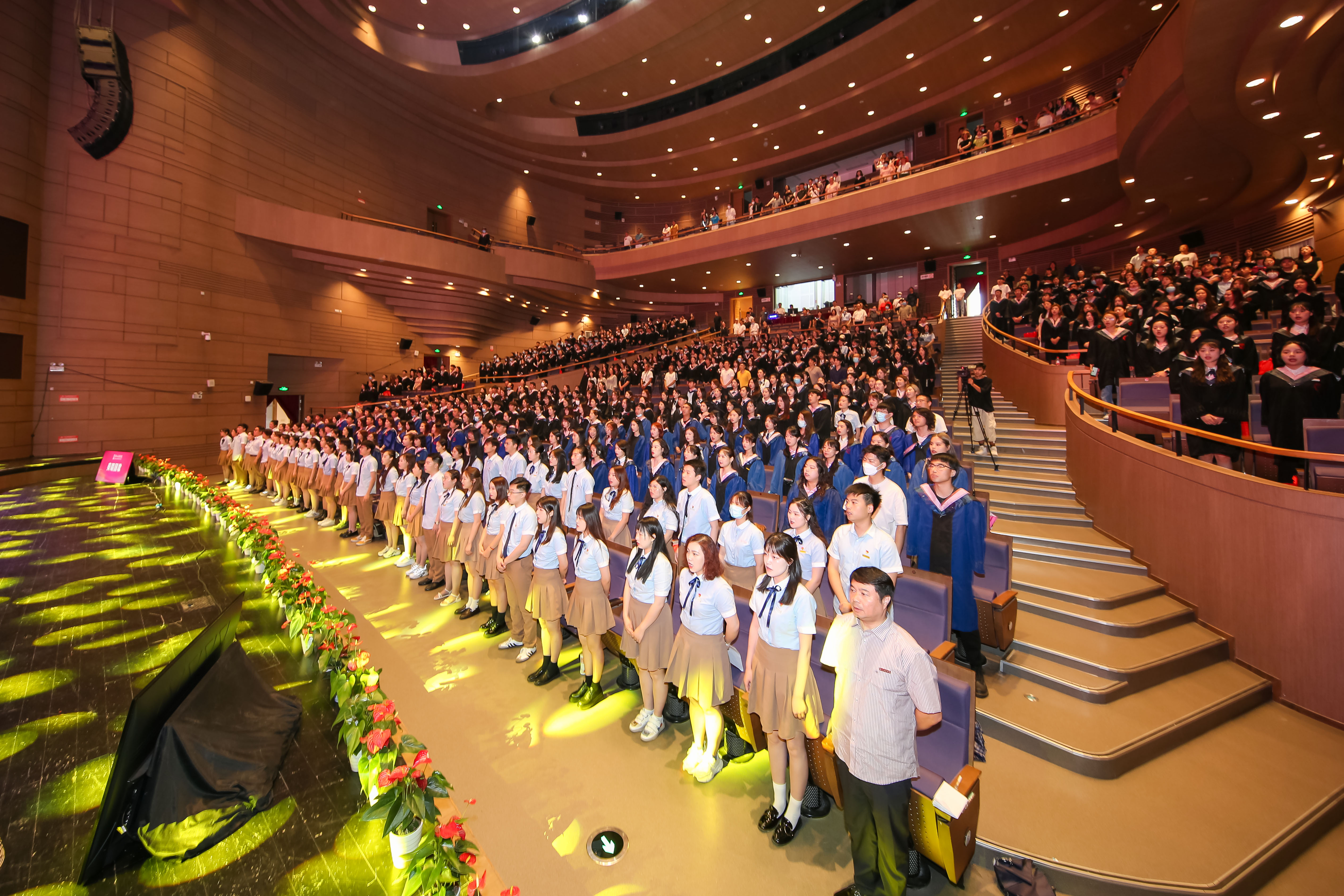 毕业典礼在快闪节目《初心与恒心》中拉开帷幕。随后,在场全体人员起立高唱国歌。