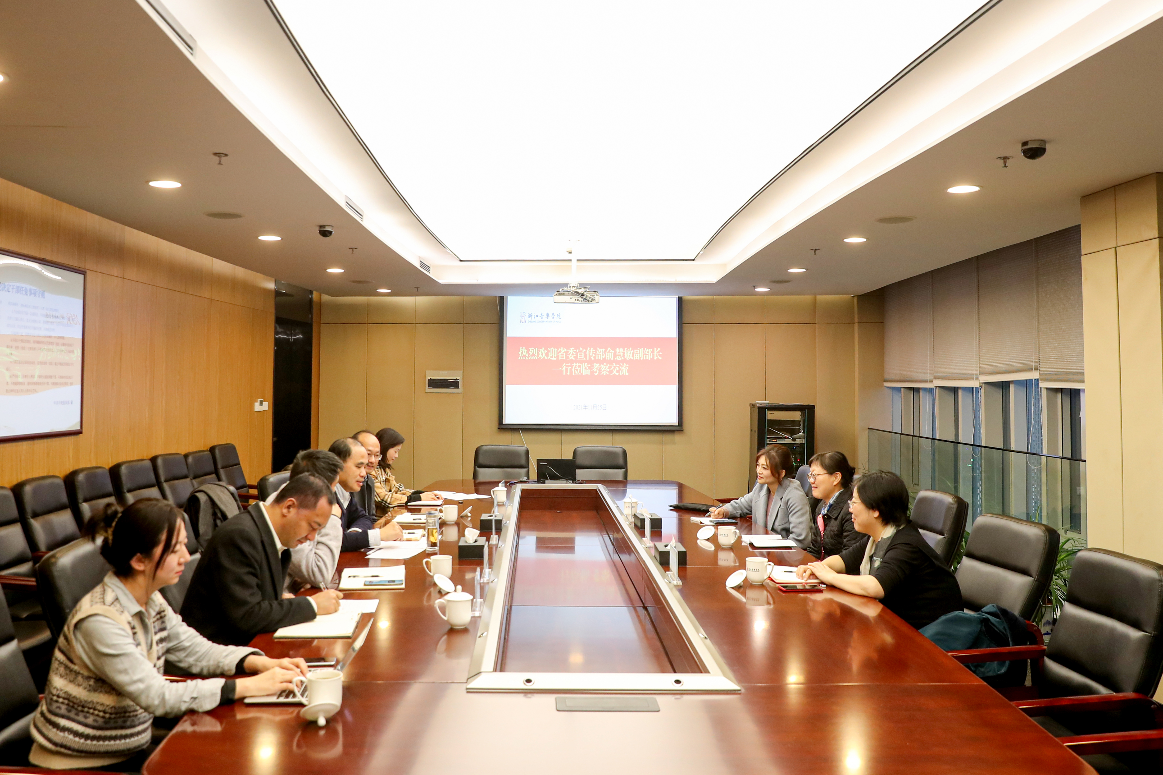 11月25日下午,省委宣传部副部长、文明办主任俞慧敏一行3人来学院考察调研,并围绕文化志愿服务和文明校园建设相关工作召开座谈会。学院党委书记胡建新,院长王瑞,党委副书记王均寅,党委委员、宣传部部长、教师工作部部长李俊陪同调研,俞慧敏、王均寅、李俊,省委宣传部志工处、公德处以及学院科研处、艺术处、团委相关负责人参加座谈会。