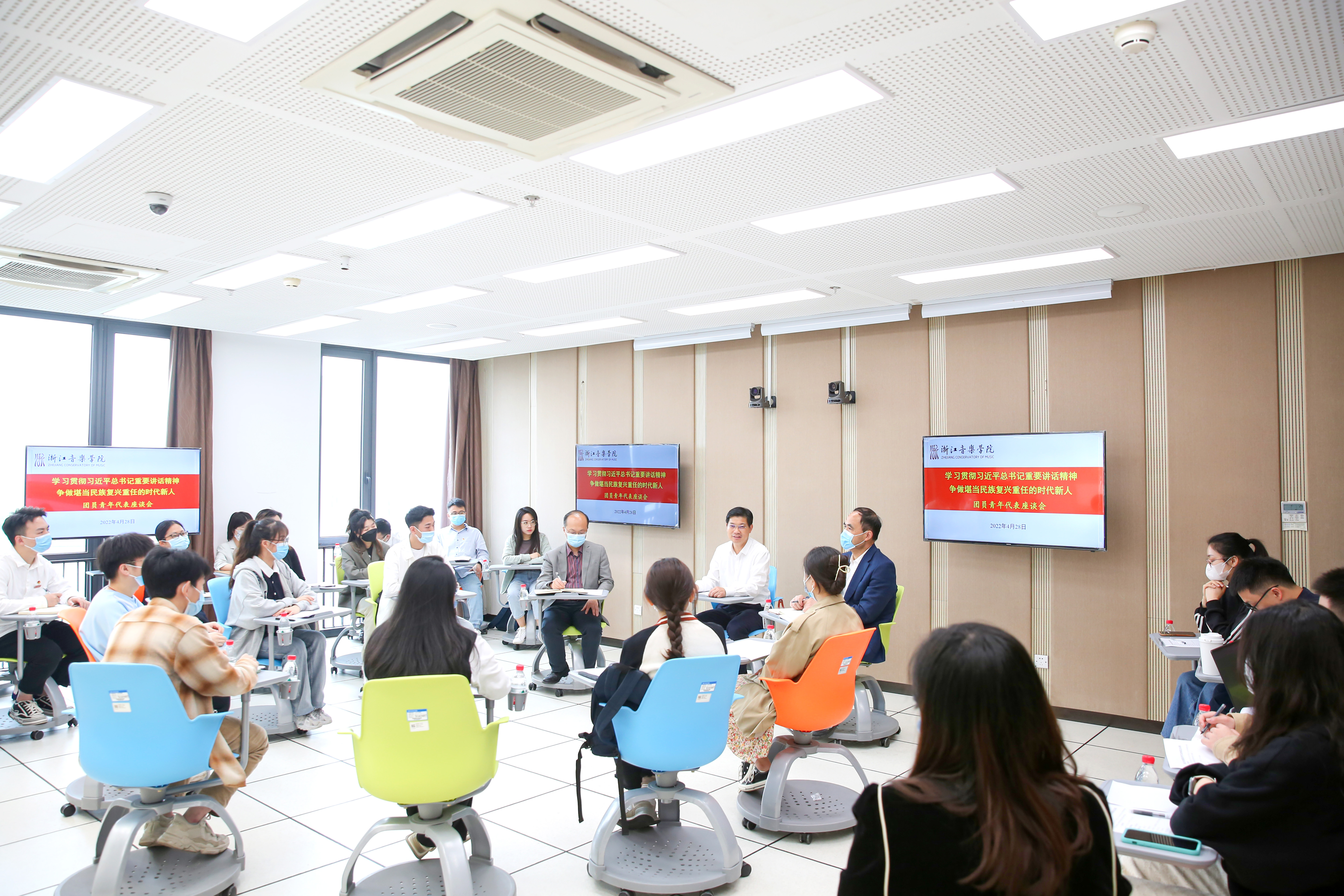 在认真听取大家发言后,干武东指出,作为一所新办艺术本科高校,浙音从无到有走到今天,凝结着无数领导、老师及社会各界的智慧和心血,也离不开我们青年学生的出色表现与完美助力,大家用扎实的素养、精湛的技艺为学院增光添彩。他对同学们提出三点希望:一是志存高远,争做勇立时代潮头的奋进者。作为新时代的中国青年,要准确把握党历史发展的主题主线、主流本质,树立远大理想、勇担时代重任、练就过硬本领、锤炼品德修为;作为新时代的文艺青年,要充分认识“文艺是时代前进的号角”的精神内核,牢记“先觉者、先行者、先倡者”职责使命;作为“红色根脉之地”的有为青年,要用心感悟真理味道、传承红色基因,秉承“浙江精神”,对标“德艺双馨”,提高思想理论水平和人文素养。二是脚踏实地,争做走在青年前列的示范引领者。团员青年要善于引领凝聚青年,紧紧围绕学院和系部(学院)工作大局,充分发挥生力军作用,引导带领团员青年与学院各项工作同频共振;要植根依靠青年,走近青年、深入青年,把握青年成长的新特点和新规律,充分运用互联网、新媒体等载体和方法,善做“瞭望哨”“好助手”;要联系服务青年,探索建立困难学生的多样化、常态化帮扶机制,从身边做起、从点滴做起,在服务师生、服务社会的生动实践中体现人生价值。三是事必尽善,争做浙音校训精神的忠实践行者。作为浙音的一份子,希望同学们积极挖掘“尽善”内核,广泛参与学院各项文化活动,进一步提升主人翁意识;要讲好“尽善”故事,善于讲好“追求艺术真谛、践行知行合一”的故事,并从中汲取前行的力量;要践行“尽善”校训,树立实事求是的科学理念和精益求精的精神品质,拓展视野、放大格局,提升境界、追求卓越,立志成为基础厚实、技艺精湛、特色鲜明、德艺双馨的优秀人才,为助力高水平一流音乐学院建设贡献青春力量。
