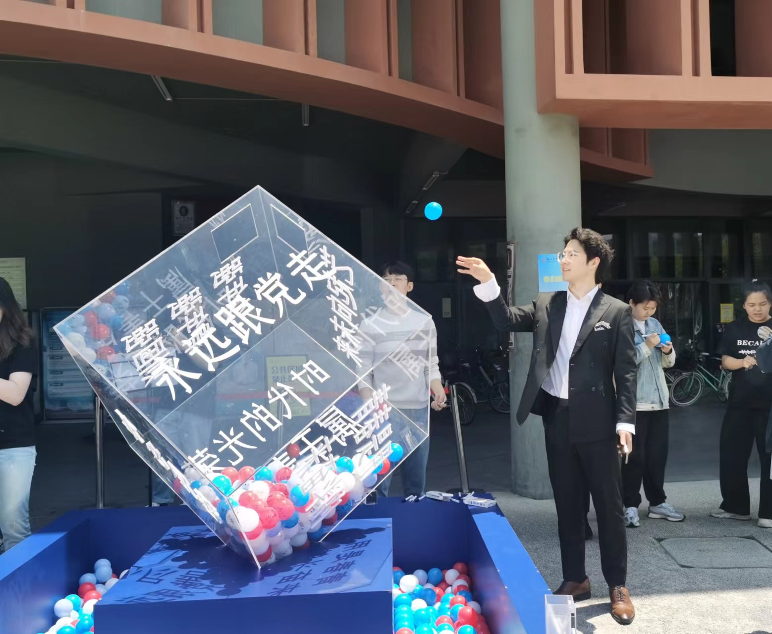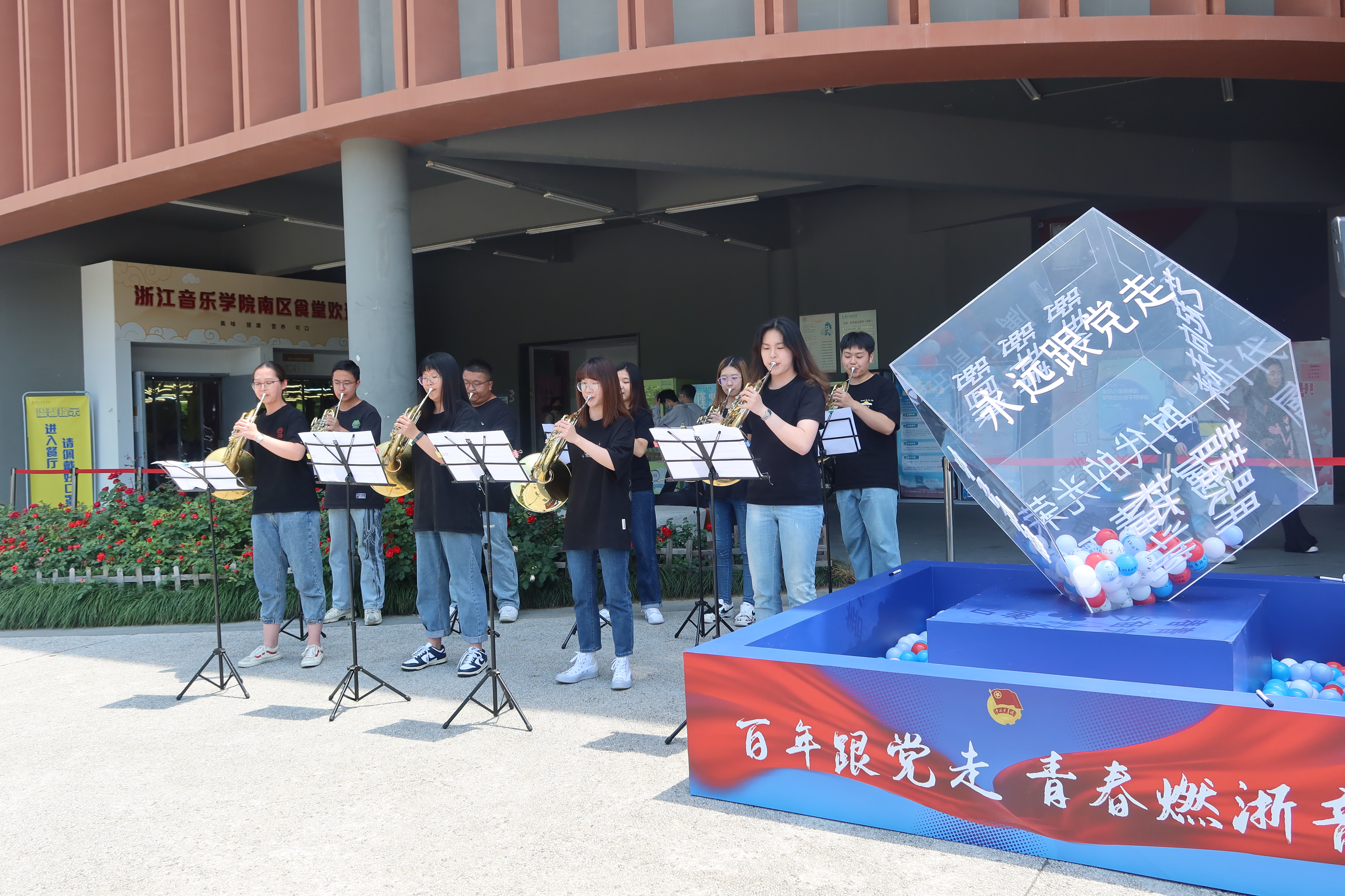 当天,浙音学子以各种方式庆祝建团百年——大家在“青春助力梦想”互动装置中投入自己的青春誓言,成为校园文化的一道靓丽风景线;管弦系学子演奏了学生原创圆号重奏作品《五四青年风》,该八重奏以红色旋律为背景,融入新颖的切分节奏和微型的对位,用现代化和声展示当代青年的精神风貌,表达对“五四精神”的崇高敬意;原创合唱音乐剧《天黑请闭眼》通过艺术形式,展现当代⼤学⽣发挥集体的力量努⼒奋进的坚定回音;音乐教育学院MTC合唱团在校园内开展快闪表演,传承五四精神,展现青年作为,共庆建团百年,共赴美好新时代。