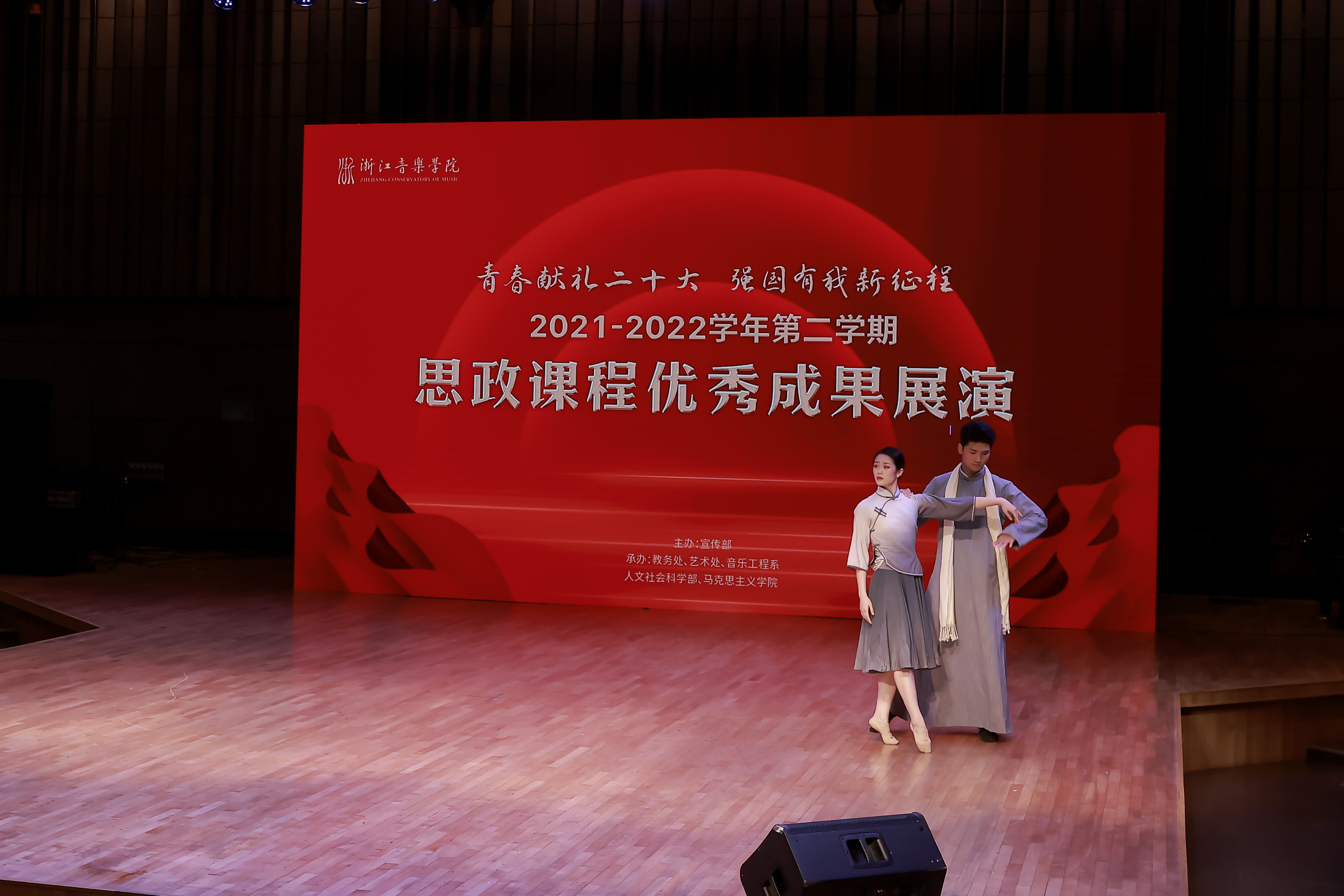 此次思政课程优秀成果展演以“青春献礼二十大·强国有我新征程”为主题,贯穿党史学习教育常态化主线,以文艺为载体,以思政课课堂为抓手,用青春之歌唱响“强国复兴有我”的时代强音,全面检视思政课程立德树人成果与实效。展演活动将浙音学子在“浙音人价值观”大讨论中凝聚的愿景共识有机融入,将课程思政教学实践有效延拓,将“音乐厅里的思政课”成果充分整合。整场演出节目丰富,既有红色经典作品再现,也有新时代文艺佳作的创新演绎,充分凸显了浙音思政课辨识度,成为一道靓丽的德育和美育风景线。