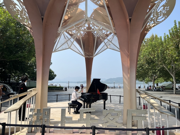 在湖滨银泰湖上乐客厅,3位钢琴系的“文艺轻骑兵”为市民带来悠扬华美的乐章。其中,研究生明亮师从金钟奖得主朱昊老师、本科生宗敬博师从金钟奖得主陈小雨老师。他们面朝西湖,指尖在琴键上流淌,向广大市民演绎了储望华先生创作的钢琴独奏曲《“茉莉花”幻想曲》等中西经典之作,不仅展现了浙音学长高超的钢琴技巧,更为美丽西湖平添了音乐的亮色。