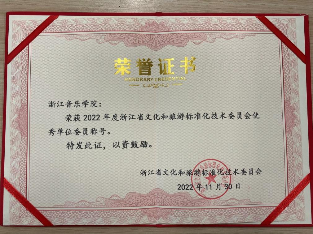 近日,浙江省文化和旅游标准化技术委员会2022年年会在杭州举行。会上,学院荣获“2022年度浙江省文化和旅游标准化技术委员会优秀单位委员”称号。