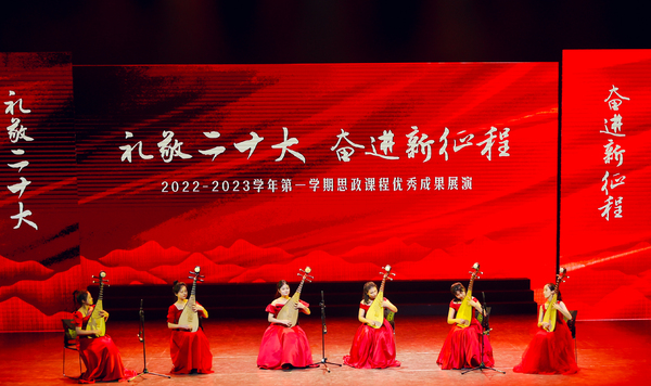 此次展演是学院举办的第九场思政课程优秀成果展演。近年来,学院全面贯彻落实习近平总书记在学校思想政治理论课教师座谈会上的讲话精神,深入贯彻落实《关于加强马克思主义学院建设的实施方案》,注重思政课教学创新改革,探索出一条“思政+音乐”的特色教学之路。马克思主义学院在思政课上列出“菜单式”清单,引导学生立足课堂教学、依托课程教材、依靠专业特点,用艺术形式演绎和再现思政课程教学内容;各院系的专任教师担纲艺术指导,从专业角度确保节目的高品质和表现力;参演学生珍惜上台演出的难得机会,在课业之余认真编排节目并反复排练,深入把握节目思想内涵和角色演绎。三者的倾情投入,使思政课程优秀成果展演的思想性、教育性和艺术性得到充分彰显,让所有的参与者和观众沉浸式地接受心灵的洗礼,进一步强化了对党的热爱并焕发出奋进新时代新征程的动力和激情。作为实践教学的延伸和深化,思政课程优秀成果展演正在成为检验检阅学院大思政工作的有效方式和落实三全育人的靓丽风景。