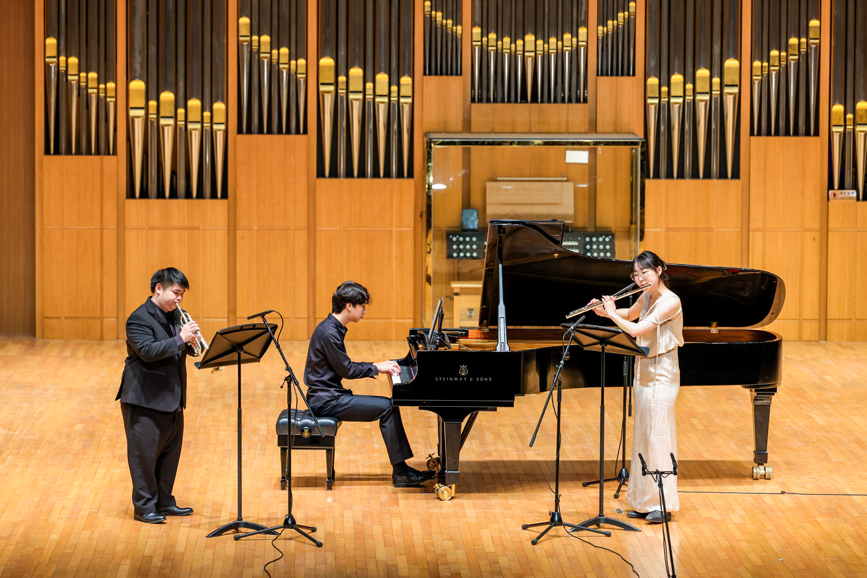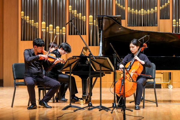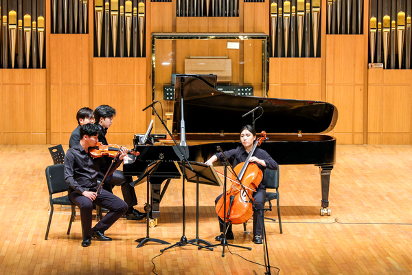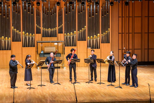 音乐会在木管八重奏——歌剧《女人心》序曲中拉开帷幕。《女人心》是莫扎特后期创作的意大利喜歌剧典范之一,被誉为“最美的重唱歌剧”。《女人心》序曲诙谐生动,跃跃欲试和忧心忡忡的两个主题生动地交织在一起,而木管八重奏的形式更是通过多彩的音色让音乐形象的碰撞进一步升华。埃里克·伊瓦森的《三重奏为小号、长笛、钢琴而作》将音乐会的气氛推向了高潮。3位同学以扎实的基本功、精湛的演奏技巧、细腻的情感表达,在独立与统一、和谐与对比中,凸显了这首作品的魅力。音乐会在贝多芬的《D大调钢琴三重奏》中进入尾声。《D大调钢琴三重奏》又被称为《“幽灵”三重奏》,被视为贝多芬中期创作的代表作。作品在结构上遵循了古典奏鸣曲式的“快—慢—快”三乐章结构,钢琴的幻想曲风格组成沉郁的氛围,弦乐的补充更加强了恍恍惚惚的气氛。曲毕,现场雷鸣般的掌声久久不能平息。