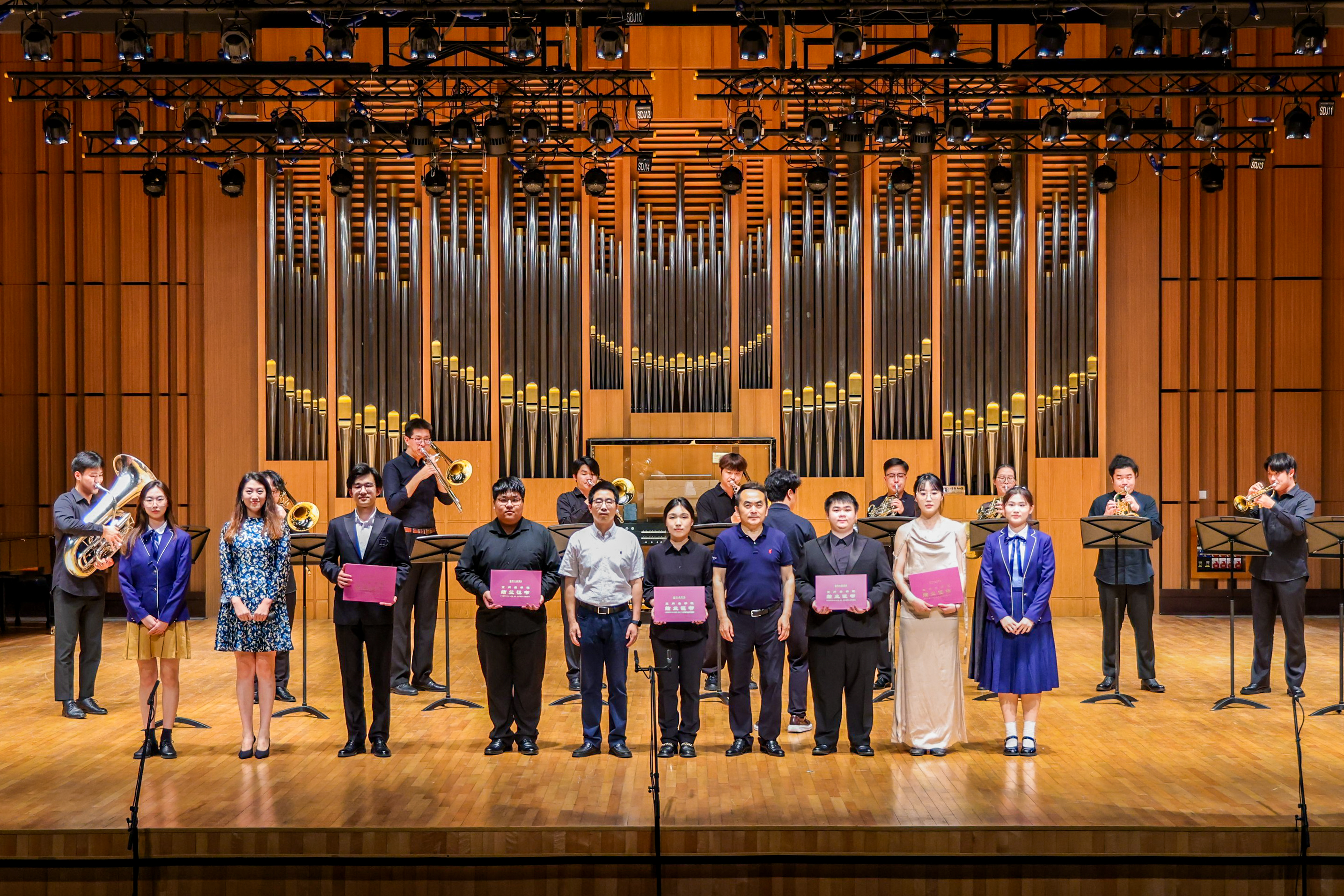 在铜管十重奏的磅礴乐声中,副院长汪洋、董德君为2023届结业生颁发结业证书。