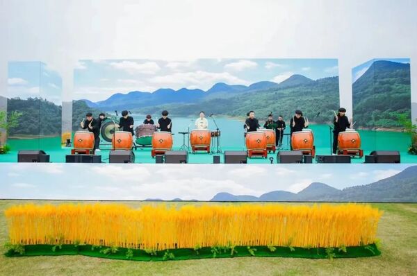 干武东宣布开幕。干武东、杨卫东、戴爱萍、邱见春、王均寅、何晓红、奚丽萍、管永丰共同击鼓启动首届中国(安吉)美丽乡村音乐节。
