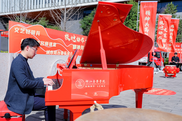活动现场,由钢琴系研究生、国际钢琴大赛金奖获得者明亮演奏了一曲《我和我的祖国》,向新中国成立75周年献礼。最后,领导击鼓宣布发车,伴随着国乐系学生的鼓乐声,55台钢琴承载着全民美育和精神共富的期冀,缓缓驶向山区海岛县。