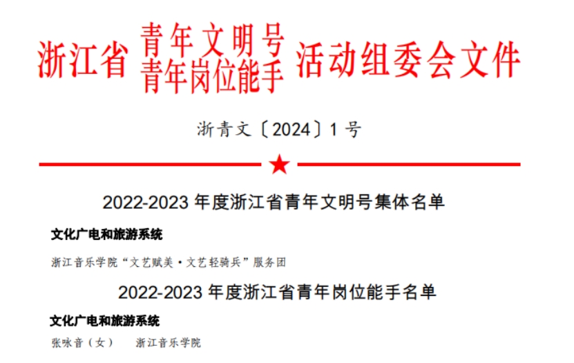 近日, 学校“文艺赋美·文艺轻骑兵”服务团和青年教师张咏音分获浙江省“青年文明号”“青年岗位能手”。据悉,文化广电和旅游系统在全省范围内仅有13家单位和个人入围获评,这是学校首次获得“青年文明号”和“青年岗位能手”。