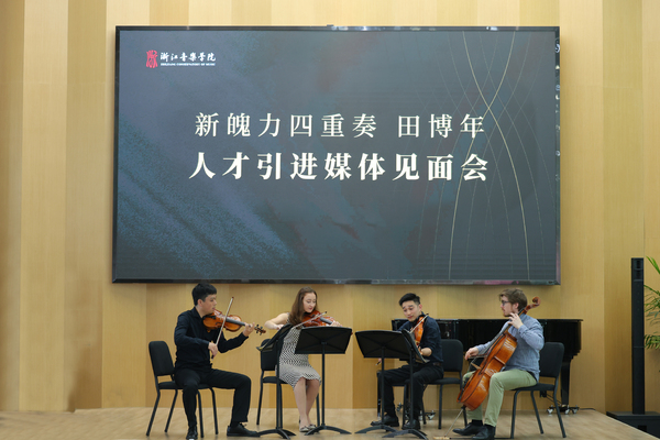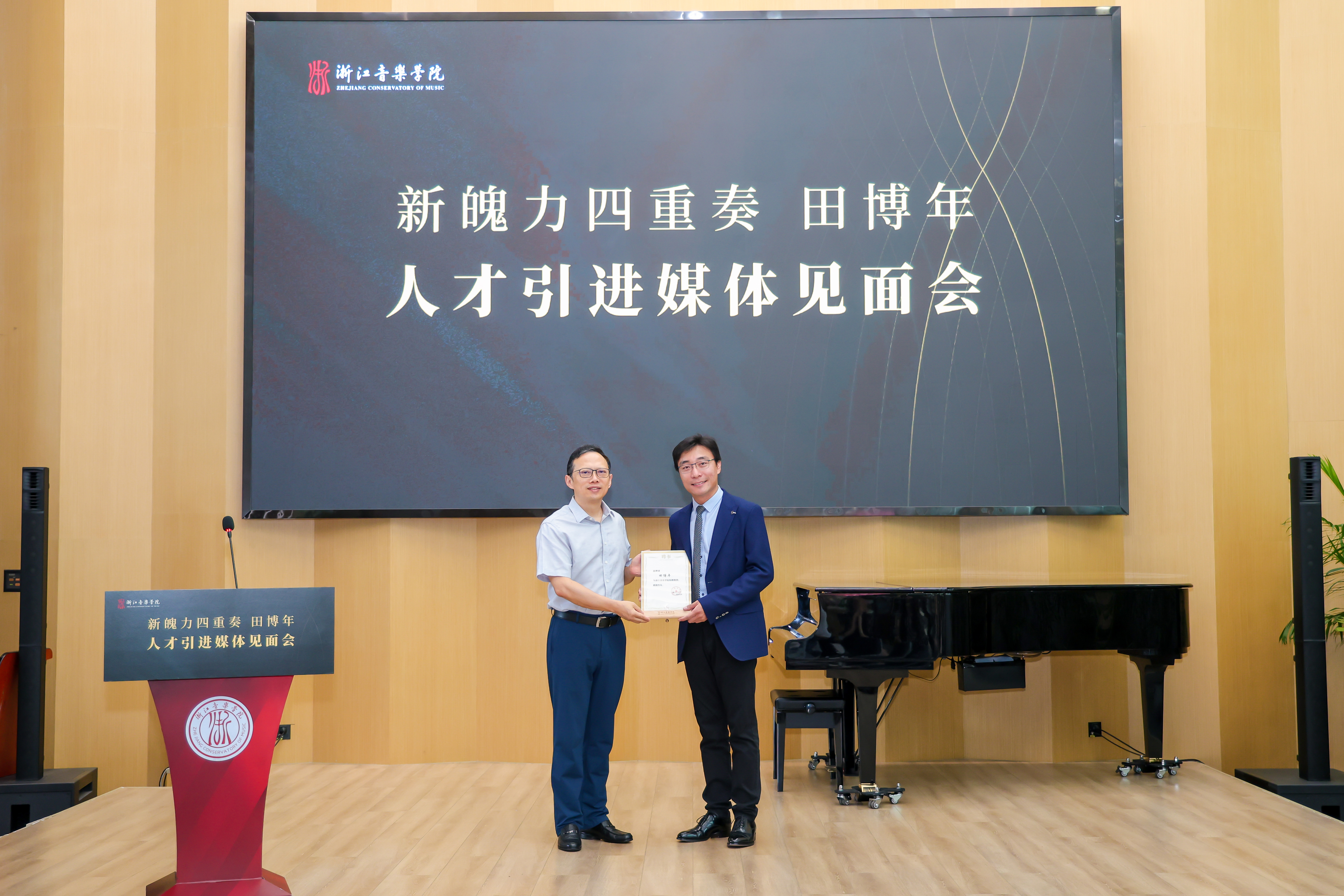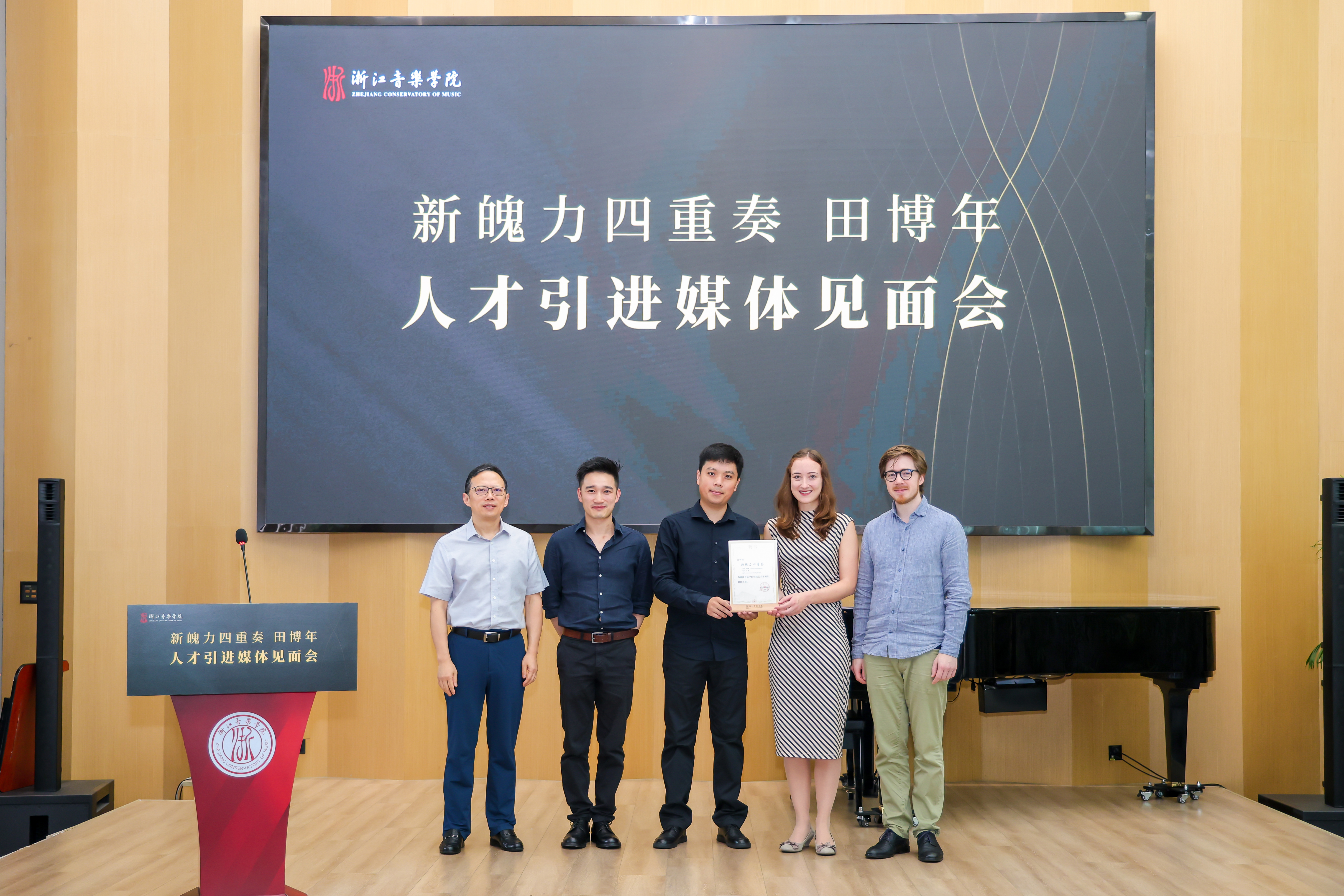 清风徐来,秋色连波,“人才强校”乐章再次奏响。9月19日上午,新魄力四重奏组合、田博年人才引进媒体见面会在教师发展中心举行。院长王瑞,党委副书记蔡亦军,副院长董德君,党委委员、组织部部长、人才办主任李俊,党委委员、宣传部部长施莹出席媒体见面会。新魄力四重奏组合成员申丹枫、Antonia Rankersberger、吕翔、Ivan Valentin Hollup Roald和田博年,新华社、中国文化报、浙江日报、潮新闻、中国教育在线等国家级、省市级主流媒体代表以及师生代表参加活动。