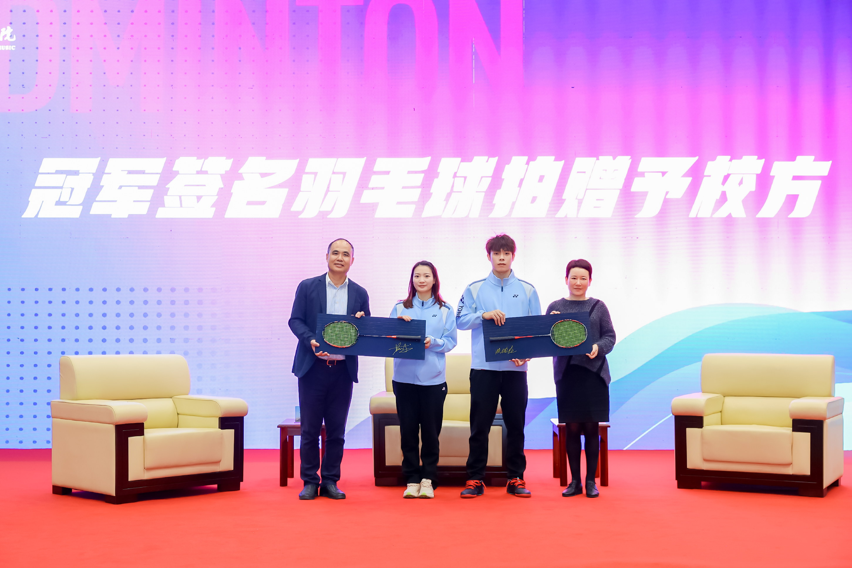 王均寅、奚丽萍向冠军送上纪念品黑胶唱片。冠军回赠签名球拍,并被聘为思政导师。